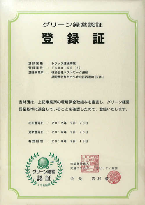 環境面では、グリーン経営を取得、輸送の中で私達にできる環境負荷低減を考え、