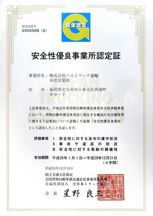安全性優良事業所認定(Gマーク) 平成20年12月18日取得